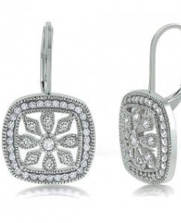 Lovely flower shaped leverback earrings set in sterling silver, stamped with a quality mark "925". Plated with rhodium to reduce tarnish. Earrings measure 1 inch L (include hook) X 0.5 inch W. Square flower measures 0.5 inch in diameter. Dazzled with pave-set cubic zirconia CZ stones, 0.5 carat in total weight. Leverback for pierced ears.